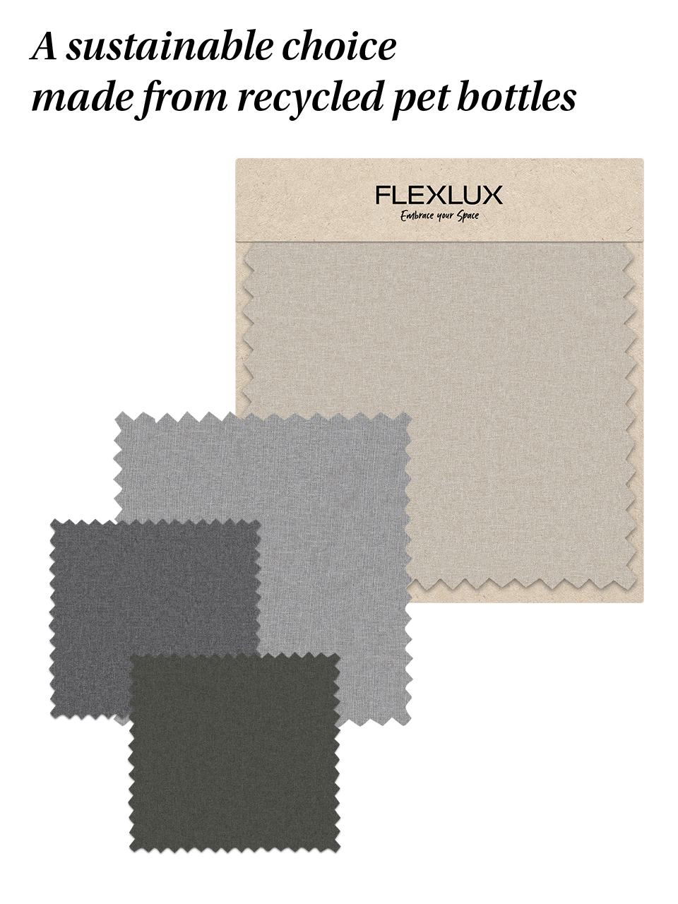 The fabric is the one that creates the identity of a product. The newest addition to the Flexlux collection is the Re-Born fabric. Re-Born is a sustainable alternative to the ordinary fabric solutions. Re-Born is woven yarn, which contains recycled pet bottles and is registered as GRS - Global Recycle Standard certified. The used plastic bottles are collected to avoid the bottles ending up in nature.
